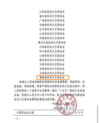 2025年,青海省民协在中国民协的精准指导与大力帮扶下,在青海省委宣传部和青海省文联党组的坚强领导下,在协会主席团、理事会科学谋划和广大会员鼎力支持下,深入笃行党的文化方针政策,锚定文化强国建设目标,紧扣新时代新的文化使命,围绕协会核心任务与文艺发展方向,扎实推进中华优秀传统文化创造性转化、创新性发展,在强化政治引领、深耕重点工作,打造特色品牌、建设人才队伍等方面取得显著成效,为建设中华民族现代文明青海篇章贡献了民间文艺力量。