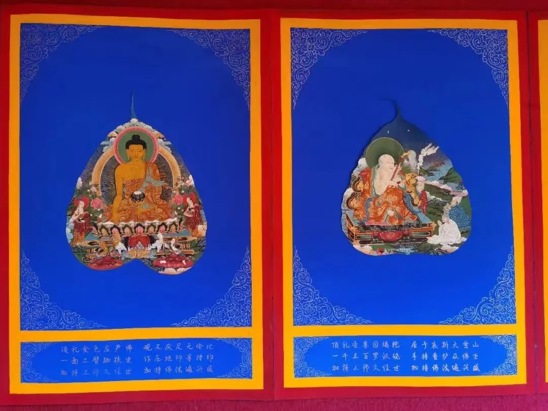 获奖作品《释迦牟尼佛及十八罗汉》以叶形规整、叶脉匀净的优质菩提叶为载体,依托叶片天然肌理顺势立意,运用化隆宗喀白日光唐卡铁线勾描、分层积染、沥粉描金、点瞳开眼等核心技法。作为国家级非物质文化遗产项目“藏族唐卡(化隆唐卡)”省级代表性传承人,更登才让以敬畏之心融自然灵韵与匠心工艺于一体,作品创作坚守非遗匠心,严循古法炮制菩提叶为天然画布,精准复刻汉藏绘画交融的千年文脉,是对传统文化精髓的创造性转化;以菩提叶这一创新媒介为载体,实现传统工艺之“守”与汉藏艺术形象融合之“创”,续写了汉藏艺术互鉴交融时代新篇,彰显创新性发展的时代活力。