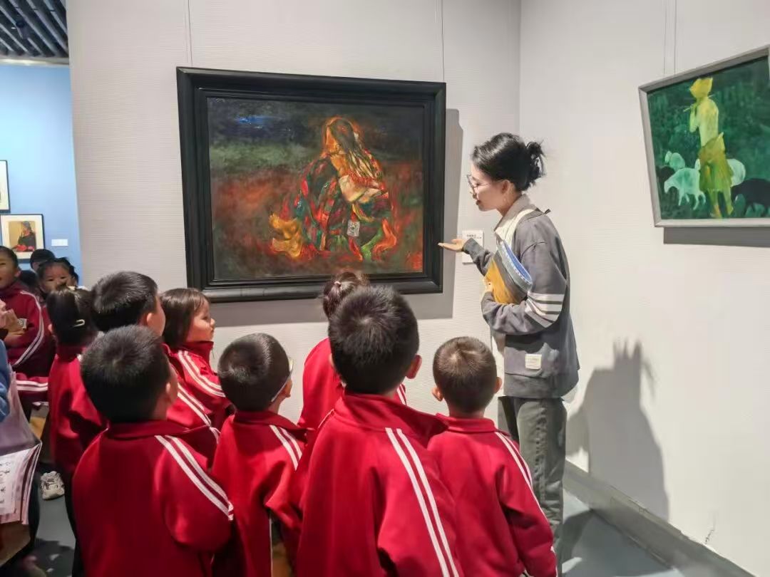 光影交错的展厅中,画布上流淌着岁月的色彩。那些高原牧歌、藏寨炊烟、节庆笑颜,仿佛都在向这些年轻的观众诉说着一个共同的主题——热爱与坚持。离开展厅时,孩子们频频回望,也许,一颗关于“美”的种子,已在他们心中悄然生根。