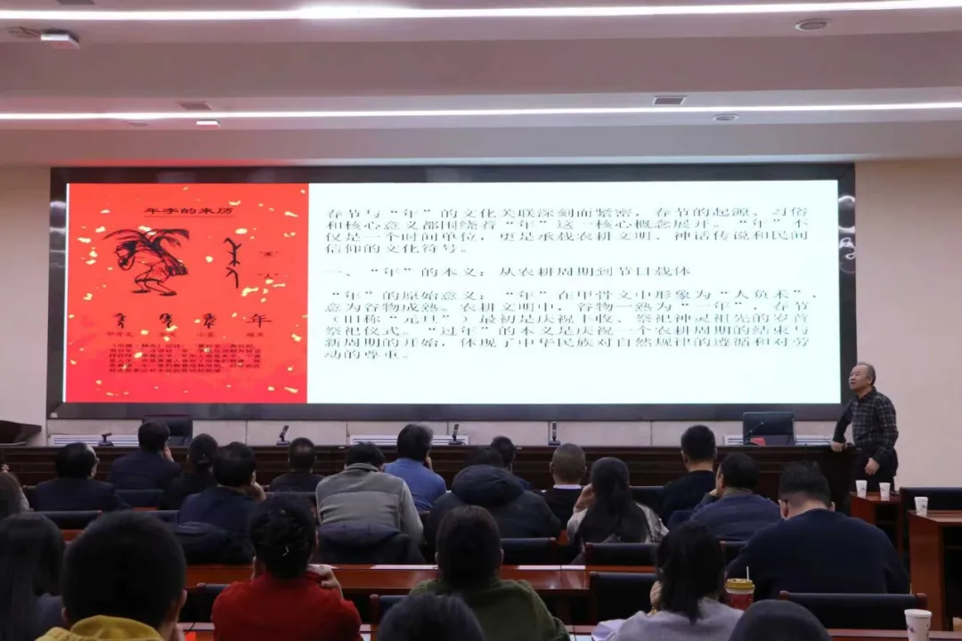 活动特邀中国民协理事、省民协副主席、青海师范大学教授文忠祥,以“我们的节日·春节——中国人庆祝传统新年的青海实践”为题,带来兼具学术深度与通俗表达的文化分享。讲座溯源春节与“年”的文化脉络,结合河湟地域特色,以民俗实践案例展现青海人庆祝新年的历史背景、传统民俗活动及其深刻的文化意义,让现场听众在溯源中读懂传统,在共鸣中凝聚文化自信。