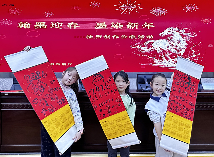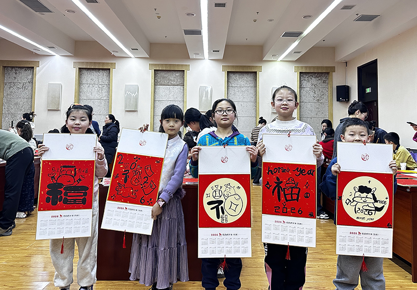 活动中,工作人员介绍了新年写“福”字的吉祥寓意与“马”字的文化渊源,带领观众感受笔墨之间的年味与情怀。在挂历创作体验环节,为参与者提供了丰富的小马造型图片及插画参考,帮助创作出充满童趣与创意的“福”、“马”字新春挂历。孩子们在亲手制作中,既接触和了解了书法艺术,也体验了传统节日文化。